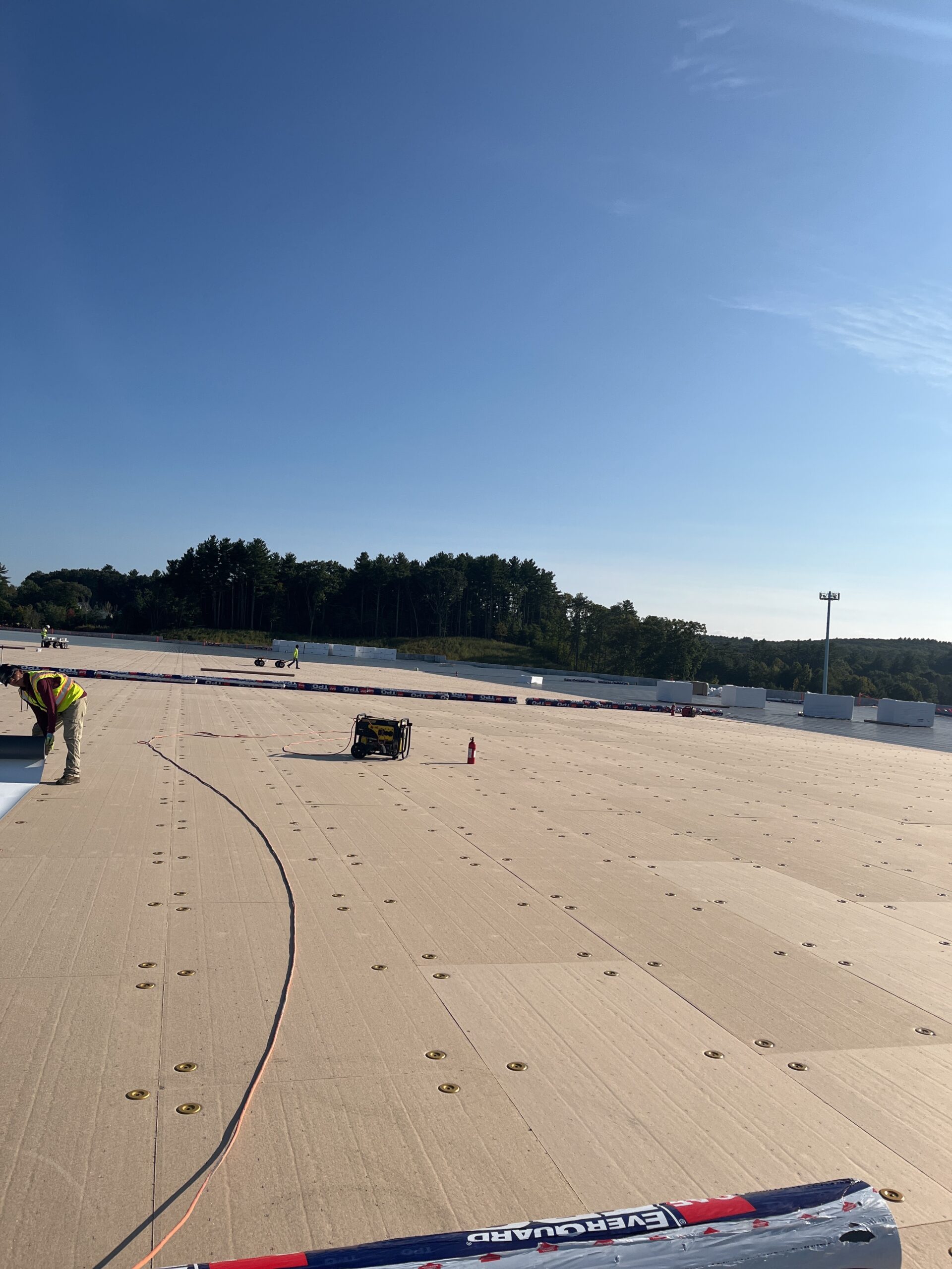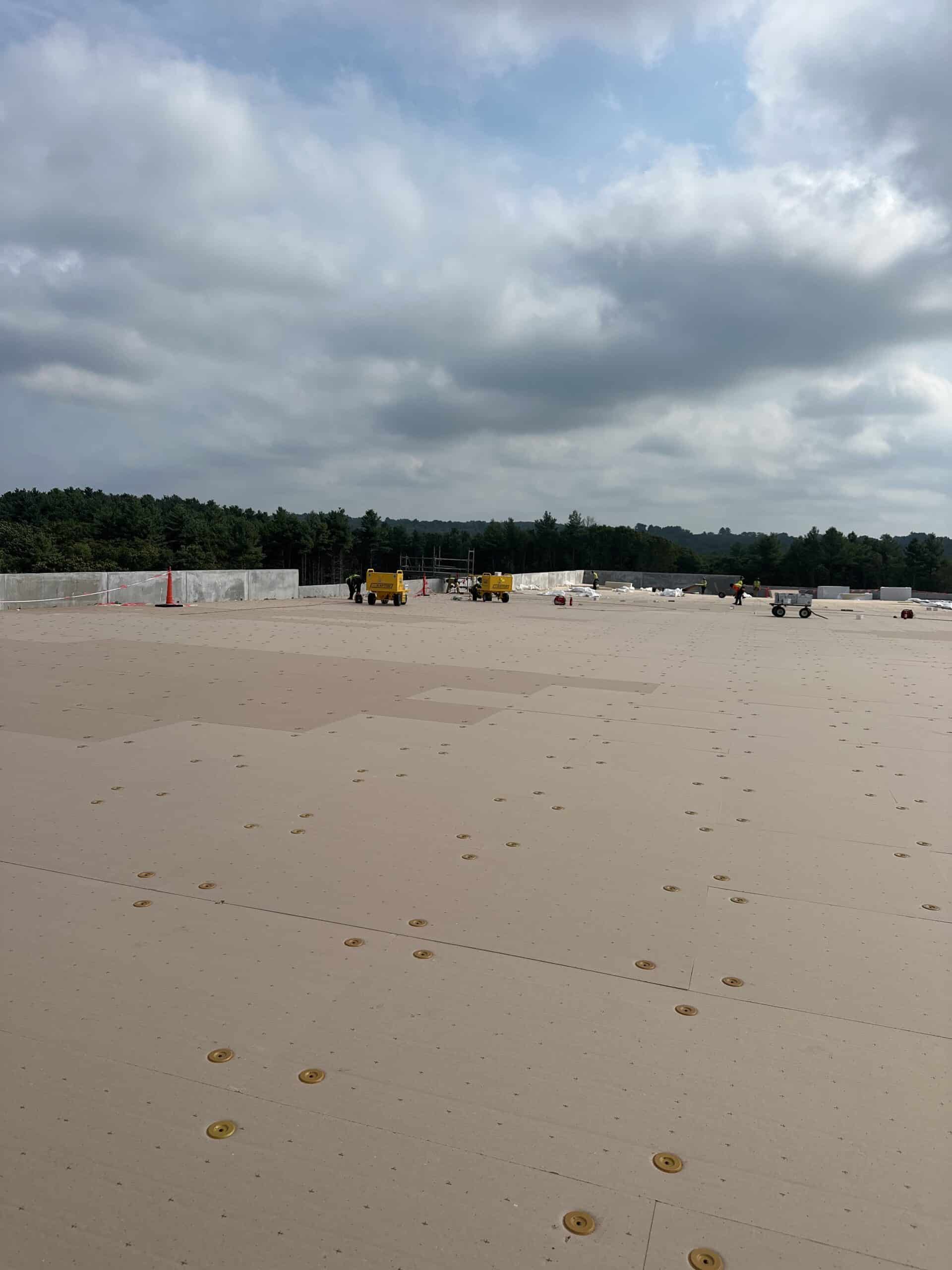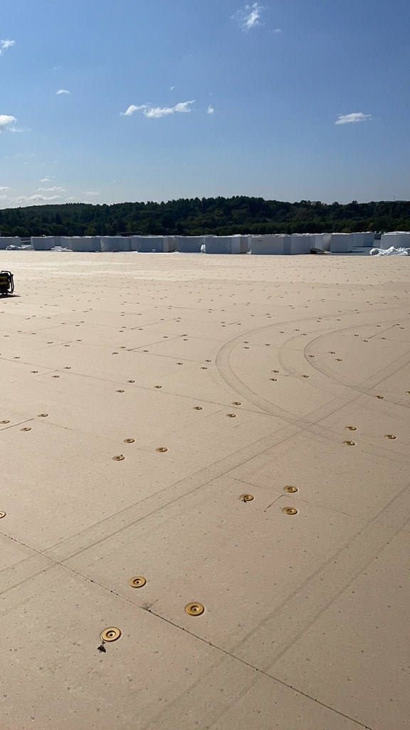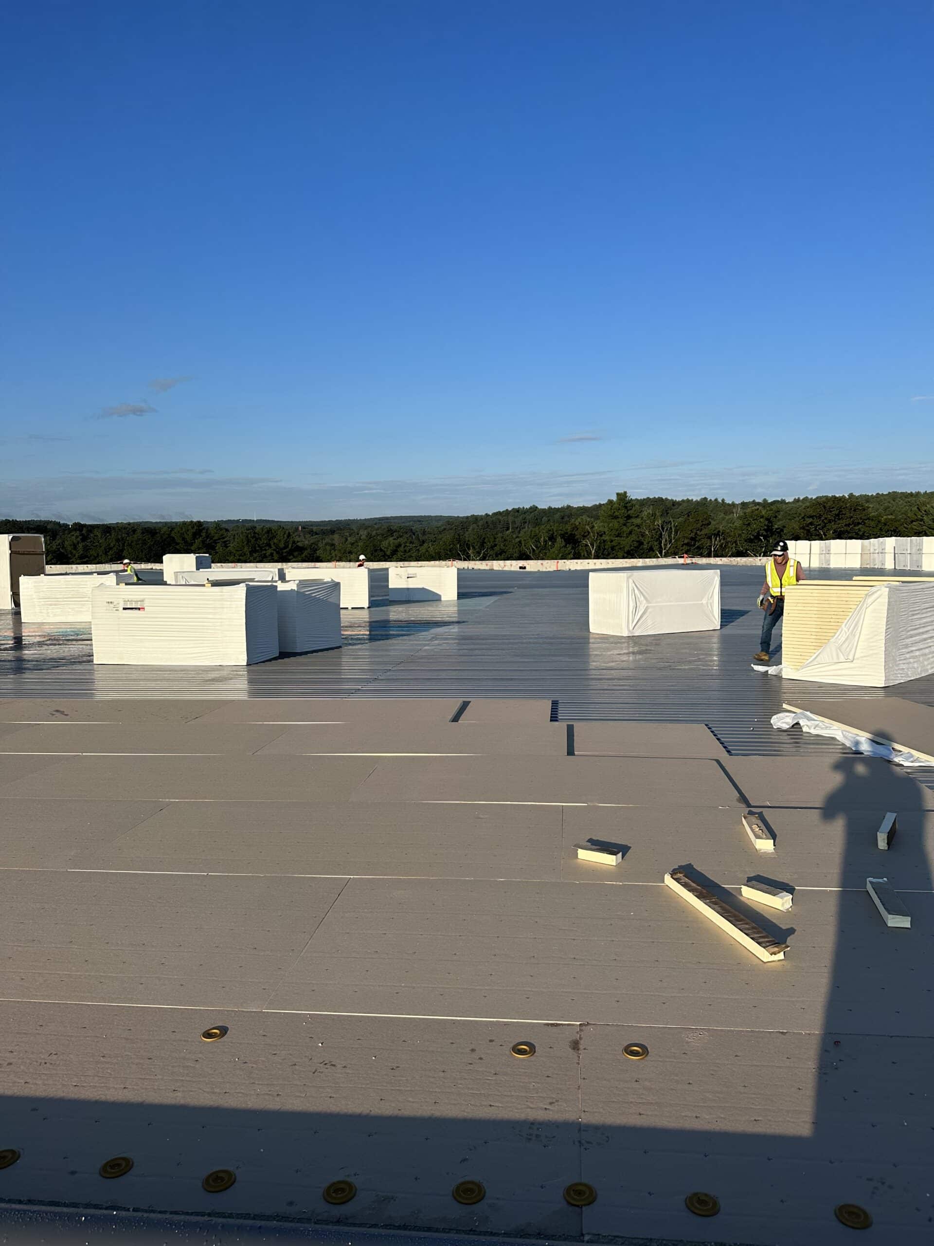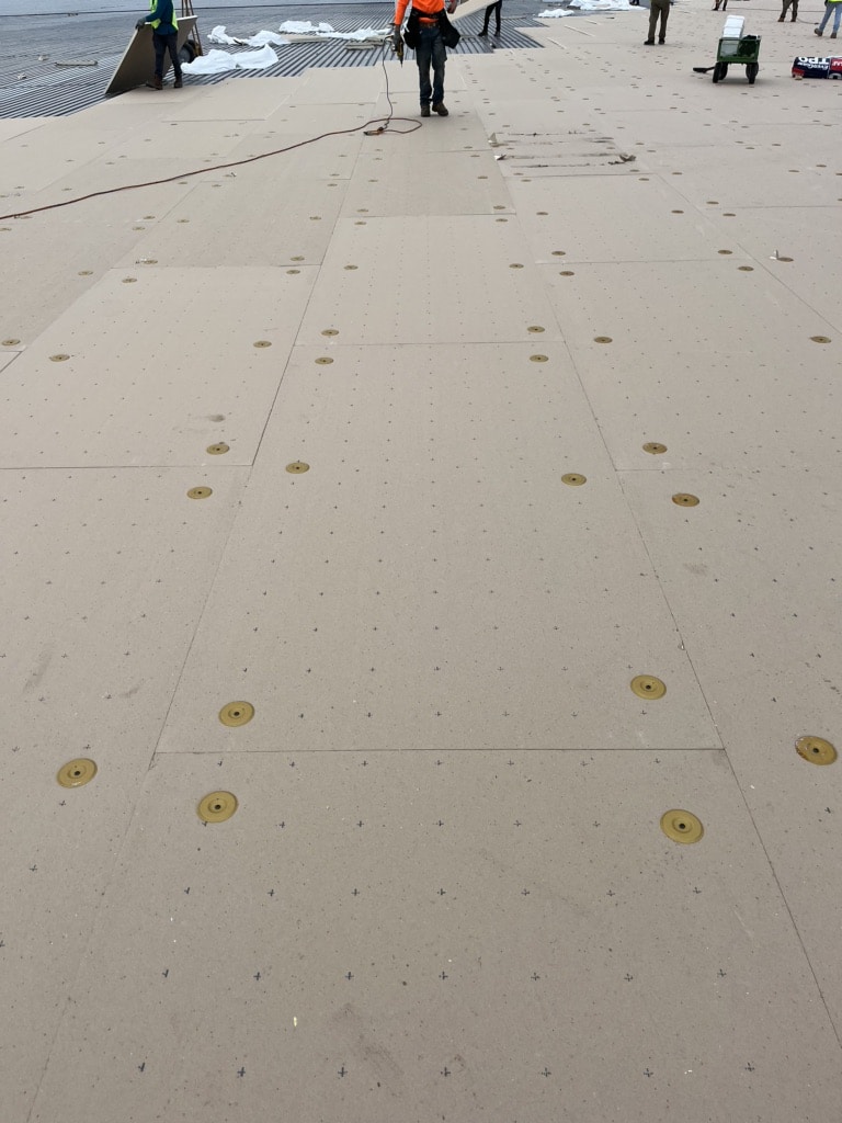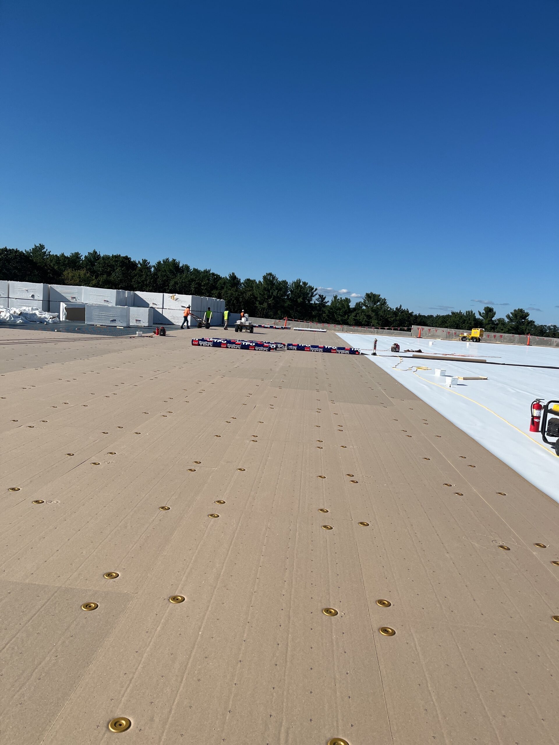 The primary roofing material for this project was GAF EverGuard TPO 60 mil, installed to meet GAF requirements for a 15 year Diamond Pledge NDL guarantee with a 72 mph wind addendum. Work was performed over a 22 gauge steel deck using a two-step insulation system: 1.75 inch EnergyGuard PolyIso was first loose laid, then a second 1.75 inch layer was mechanically fastened with Drill-Tec XHD fasteners and RhinoBond TPO plates. Fastening density increased from field to perimeter to corners for improved wind performance. After insulation installation, the EverGuard TPO membrane was installed per GAF specifications to complete the warranted assembly.