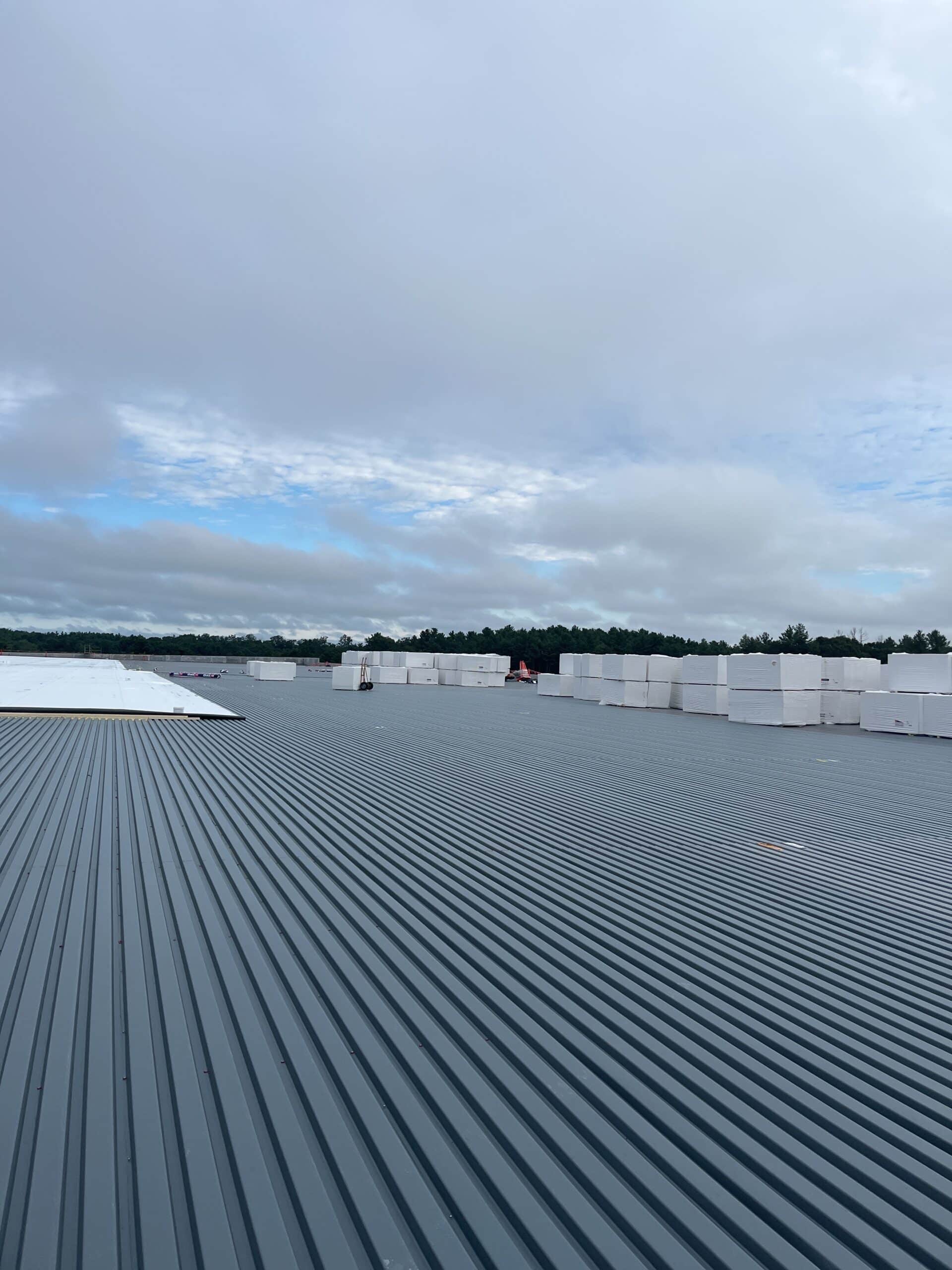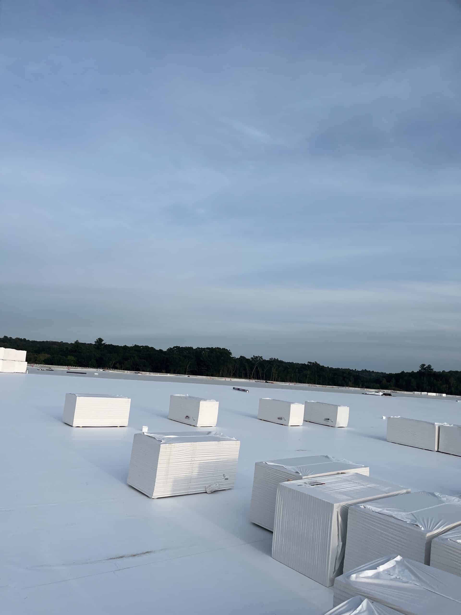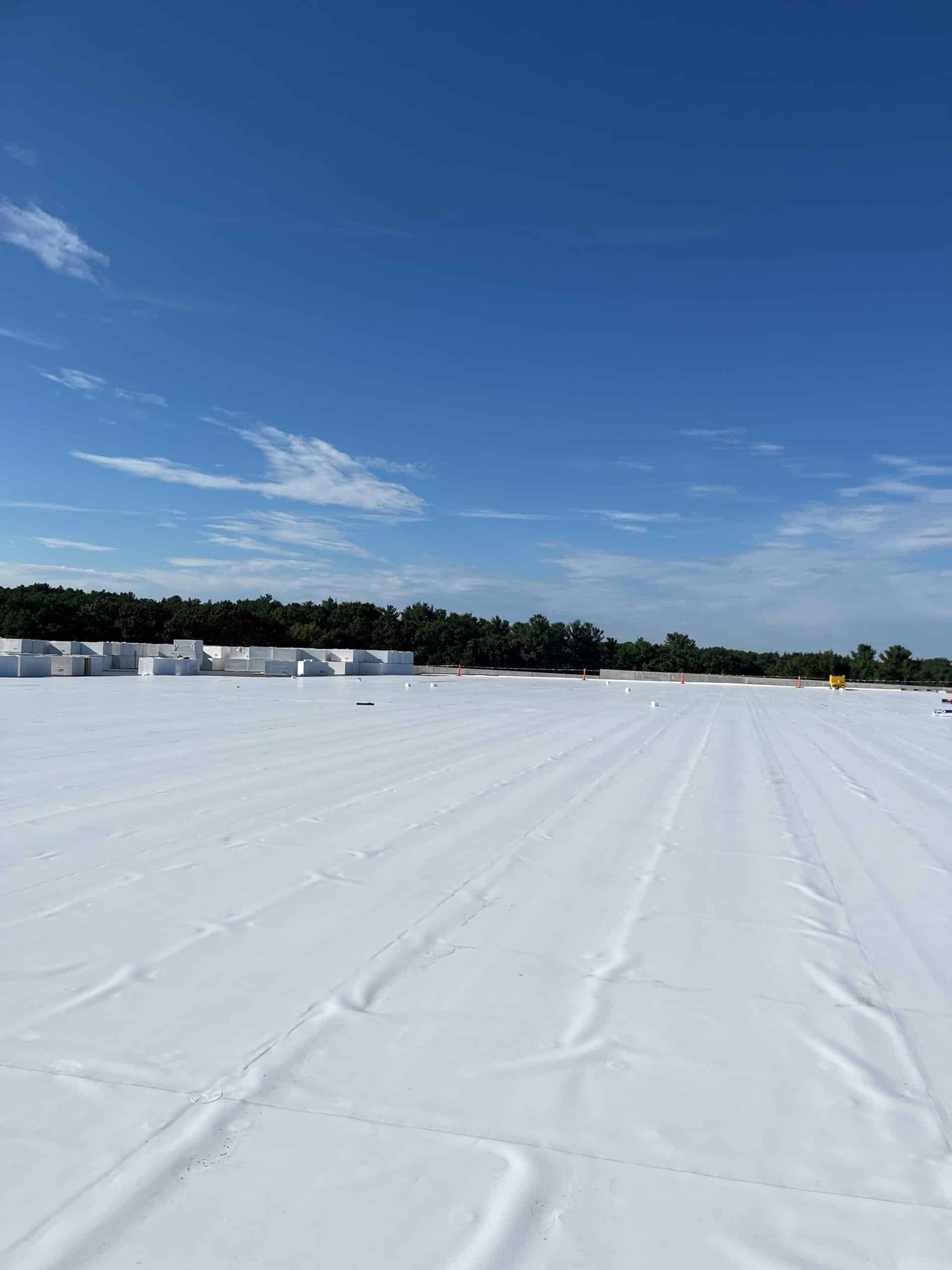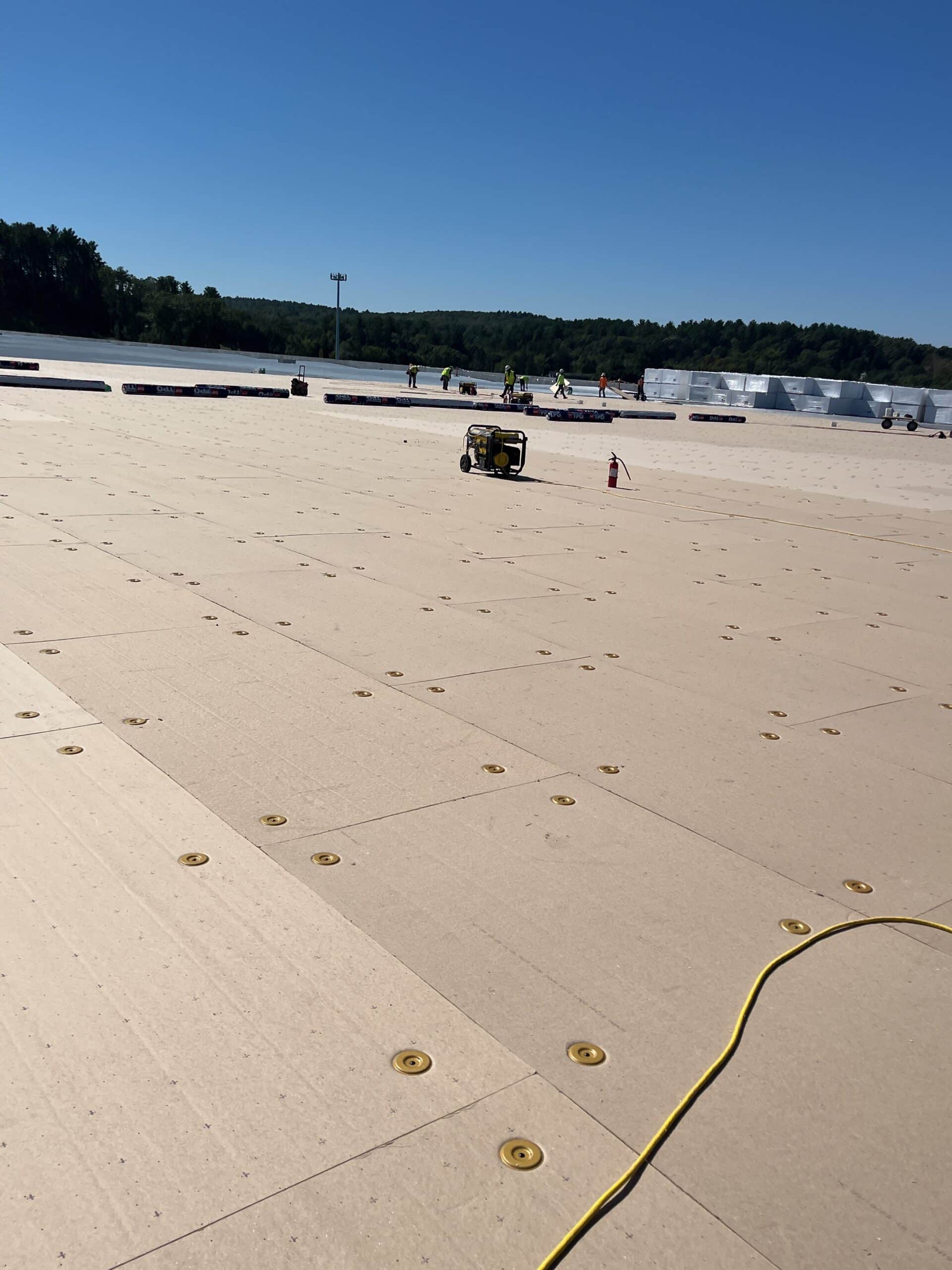The primary roofing material for this project was GAF EverGuard TPO 60 mil, installed to meet GAF requirements for a 15 year Diamond Pledge NDL guarantee with a 72 mph wind addendum. Work was performed over a 22 gauge steel deck using a two-step insulation system: 1.75 inch EnergyGuard PolyIso was first loose laid, then a second 1.75 inch layer was mechanically fastened with Drill-Tec XHD fasteners and RhinoBond TPO plates. Fastening density increased from field to perimeter to corners for improved wind performance. After insulation installation, the EverGuard TPO membrane was installed per GAF specifications to complete the warranted assembly.