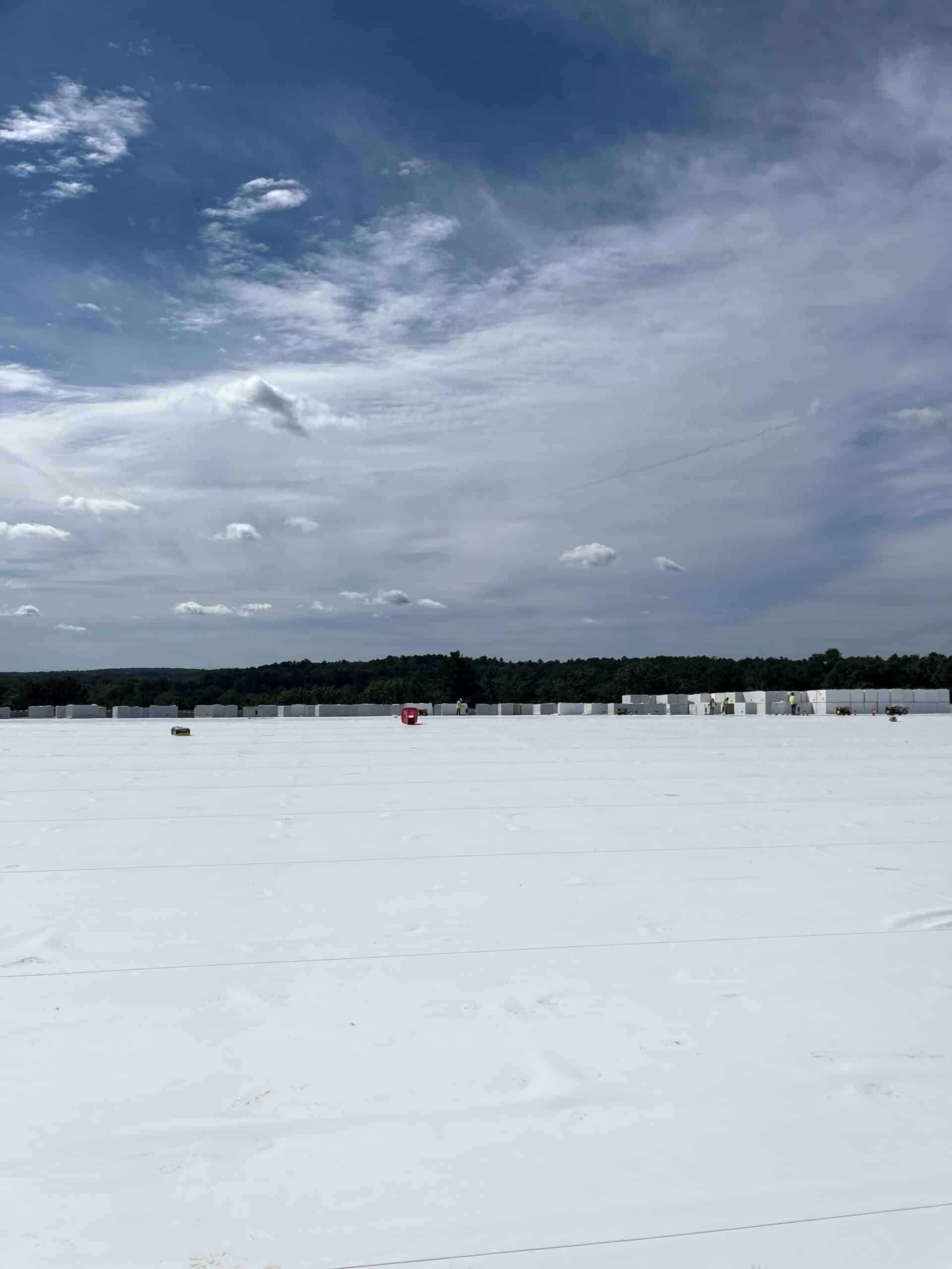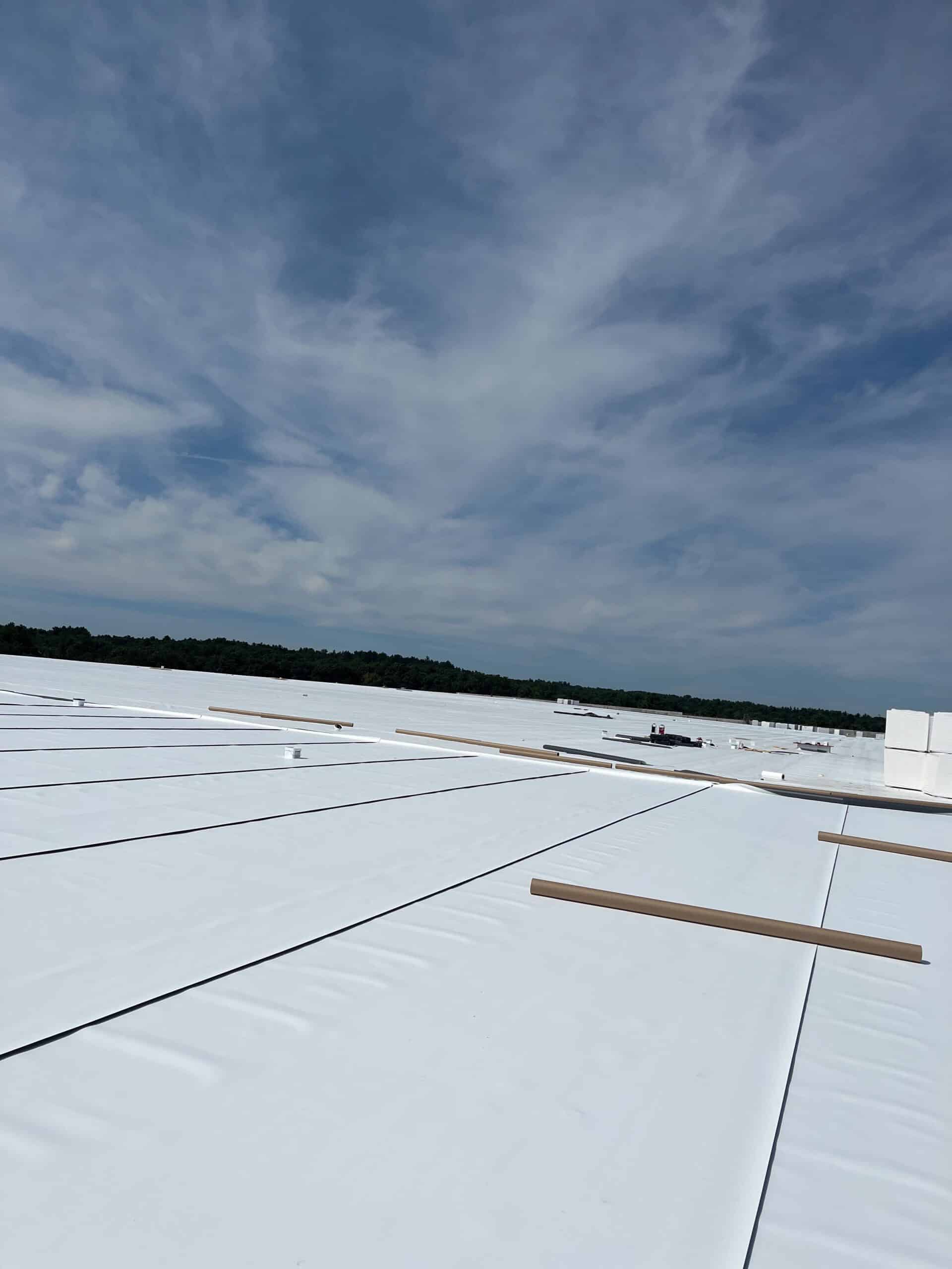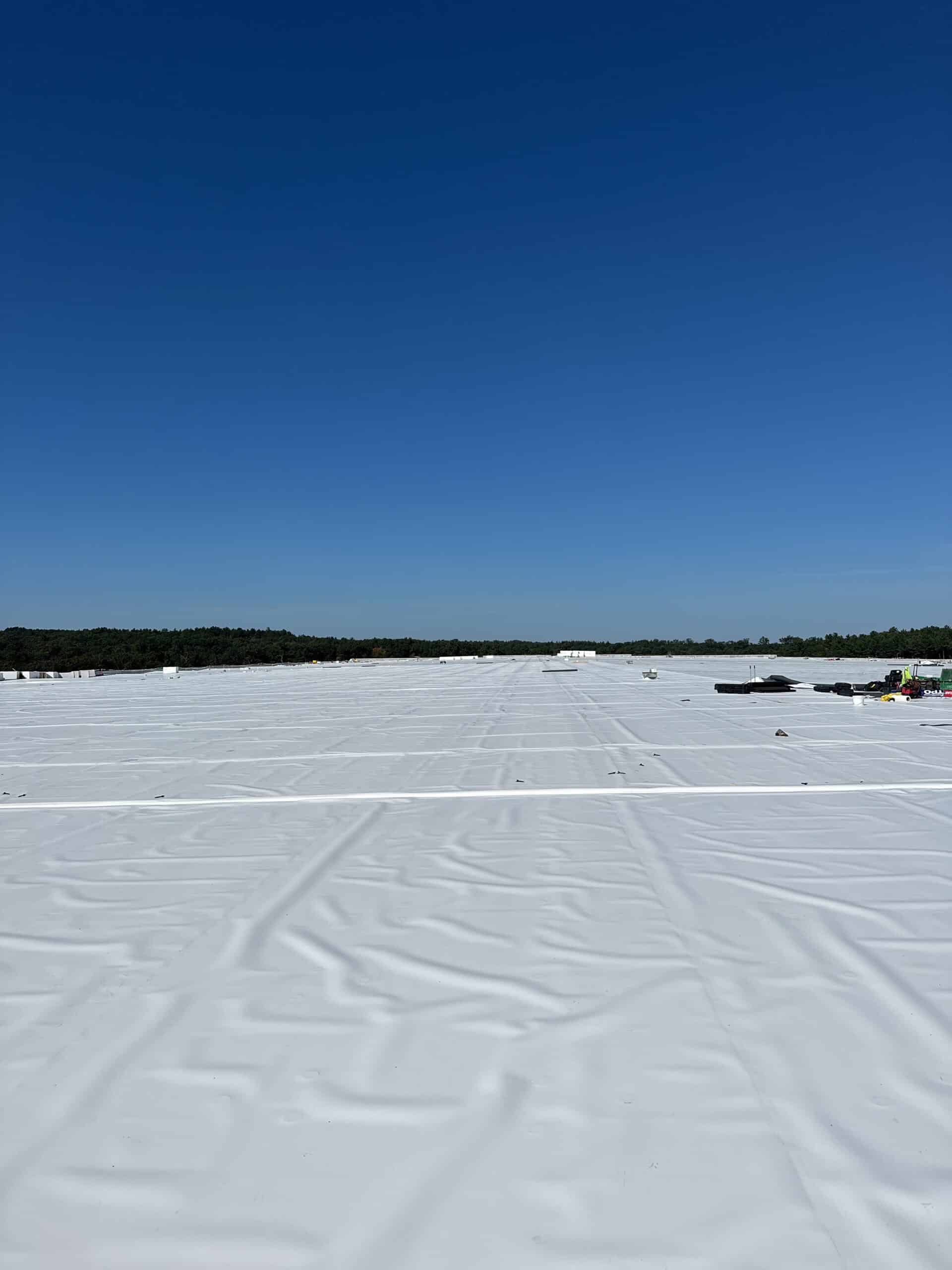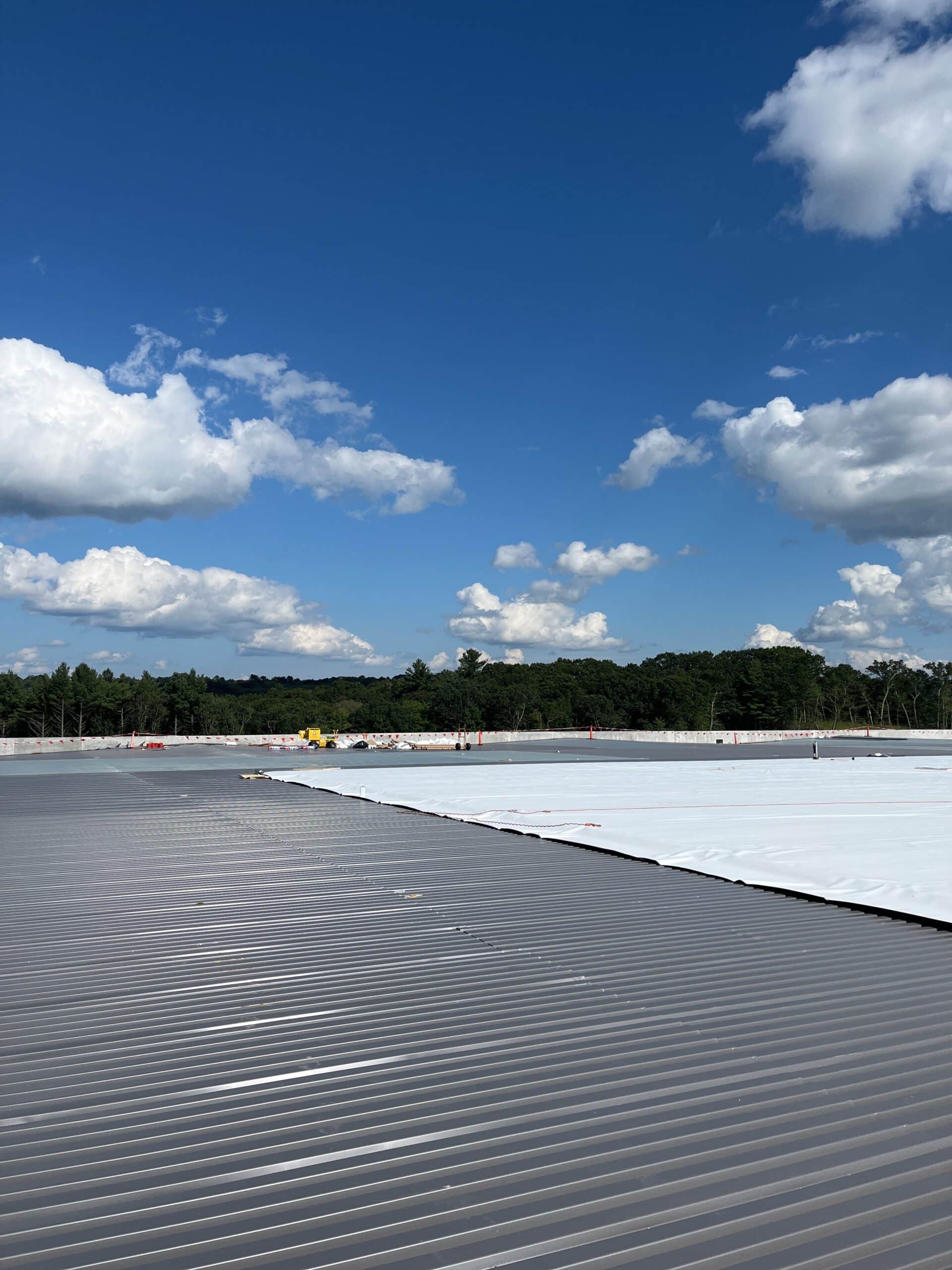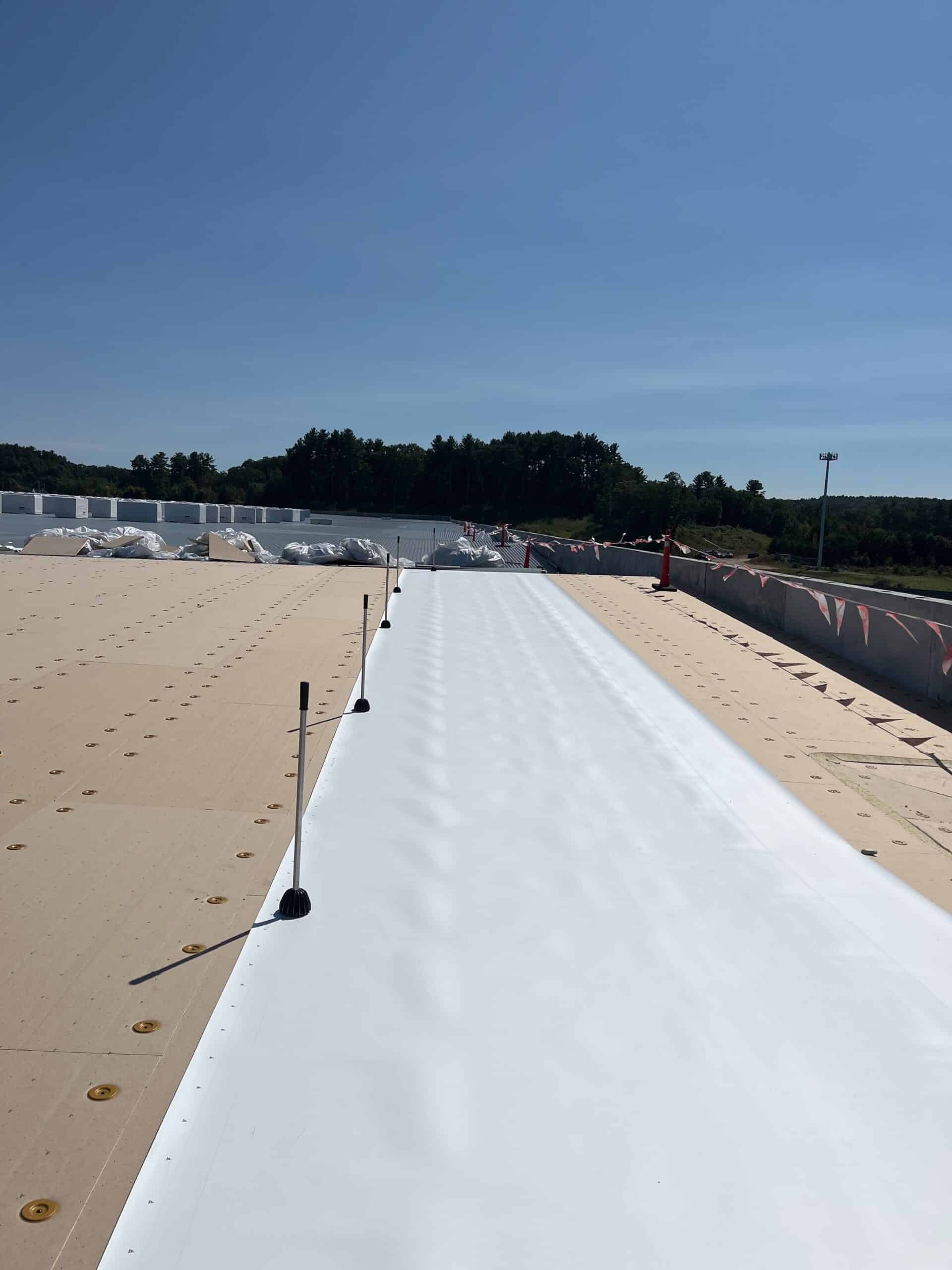 The primary roofing material for this project was GAF EverGuard TPO 60 mil, installed to meet GAF requirements for a 15 year Diamond Pledge NDL guarantee with a 72 mph wind addendum. Work was performed over a 22 gauge steel deck using a two-step insulation system: 1.75 inch EnergyGuard PolyIso was first loose laid, then a second 1.75 inch layer was mechanically fastened with Drill-Tec XHD fasteners and RhinoBond TPO plates. Fastening density increased from field to perimeter to corners for improved wind performance. After insulation installation, the EverGuard TPO membrane was installed per GAF specifications to complete the warranted assembly.