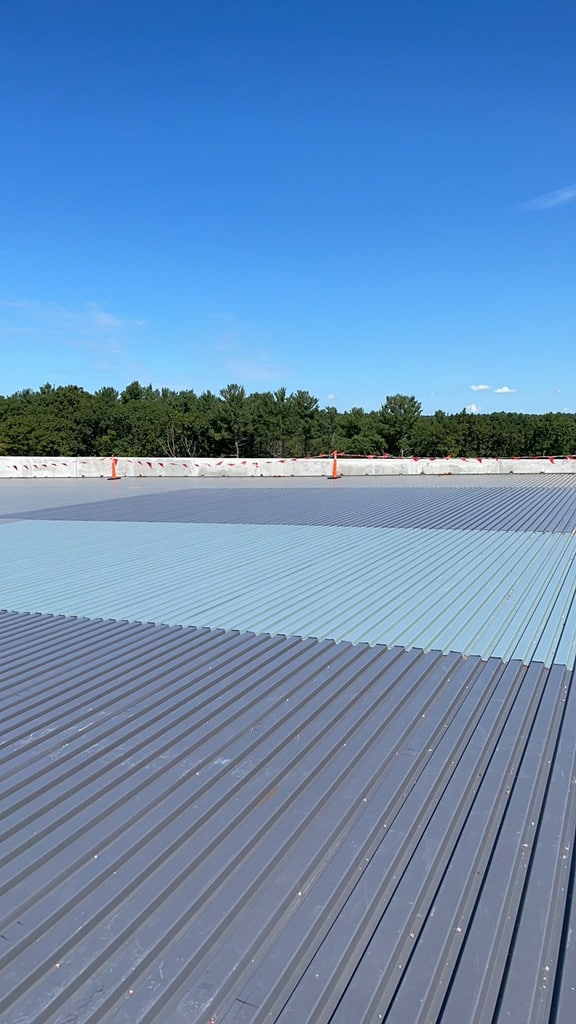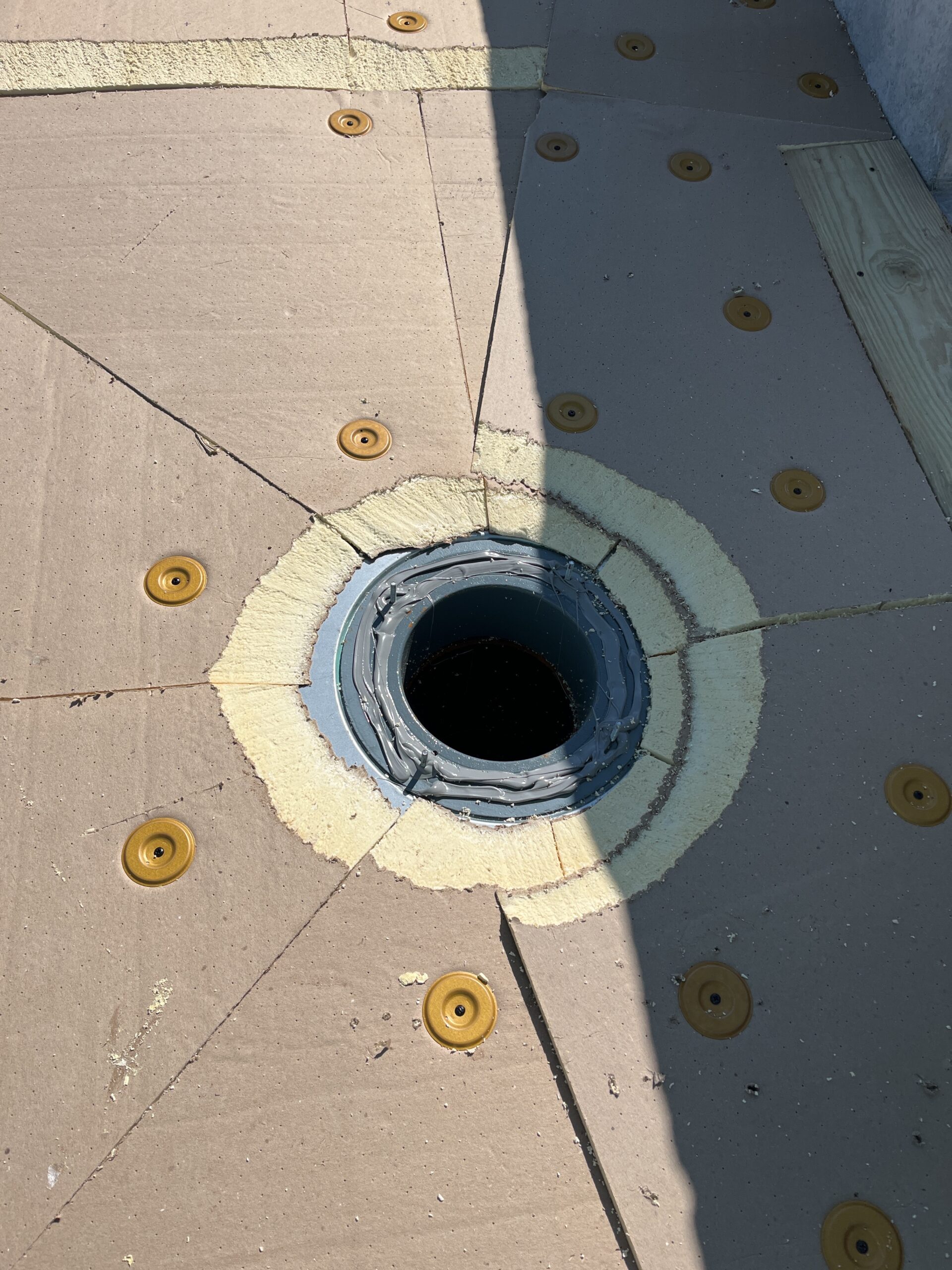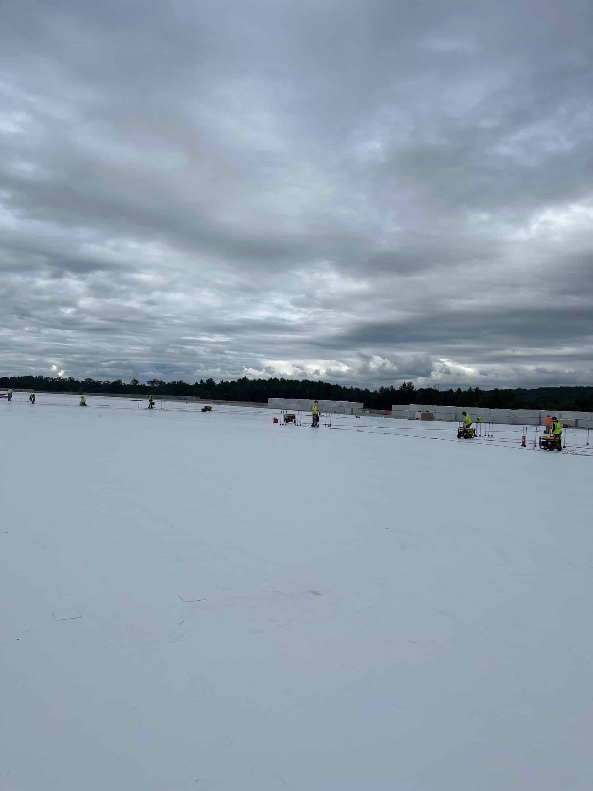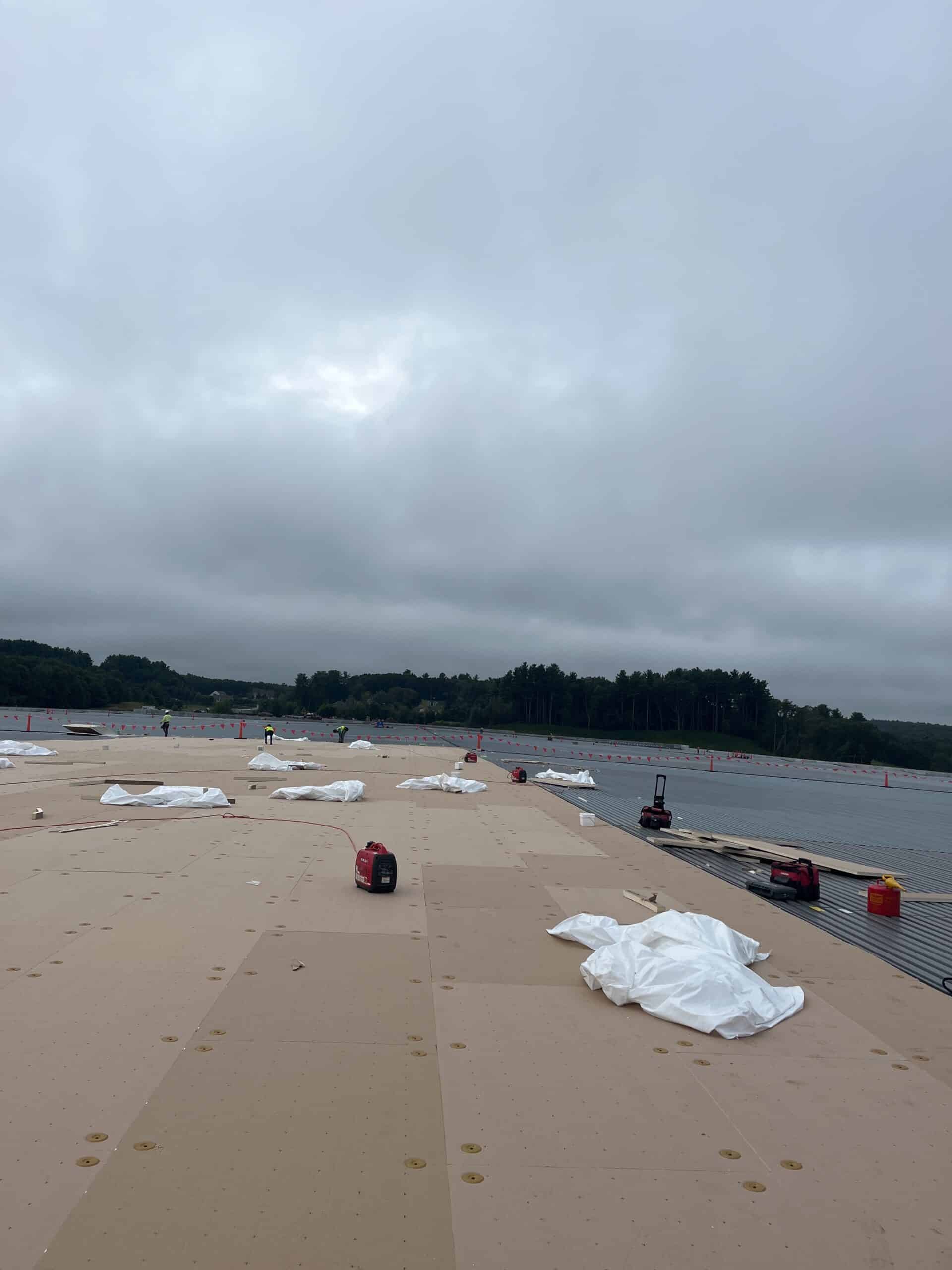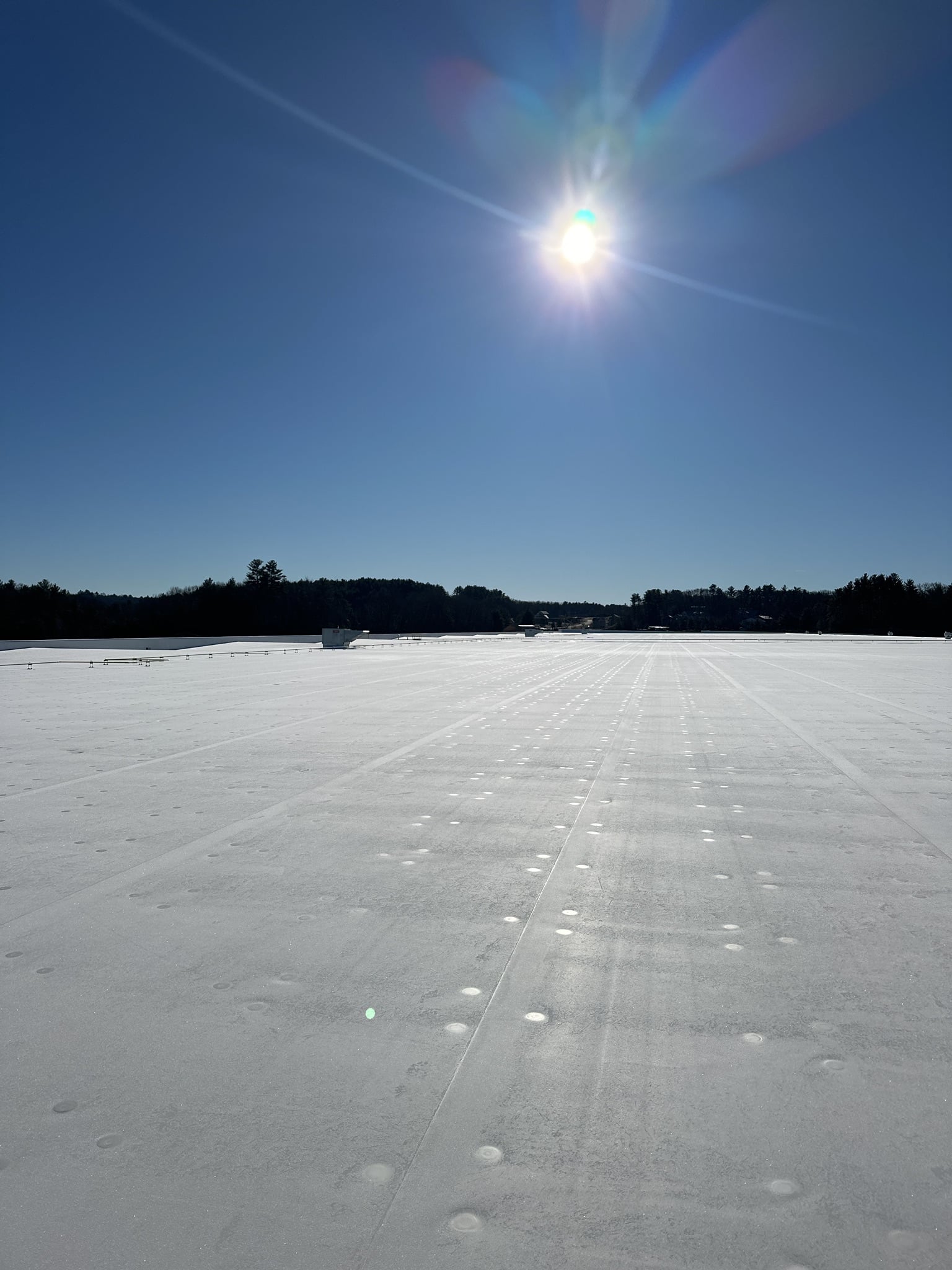 The primary roofing material for this project was GAF EverGuard TPO 60 mil, installed to meet GAF requirements for a 15 year Diamond Pledge NDL guarantee with a 72 mph wind addendum. Work was performed over a 22 gauge steel deck using a two-step insulation system: 1.75 inch EnergyGuard PolyIso was first loose laid, then a second 1.75 inch layer was mechanically fastened with Drill-Tec XHD fasteners and RhinoBond TPO plates. Fastening density increased from field to perimeter to corners for improved wind performance. After insulation installation, the EverGuard TPO membrane was installed per GAF specifications to complete the warranted assembly.