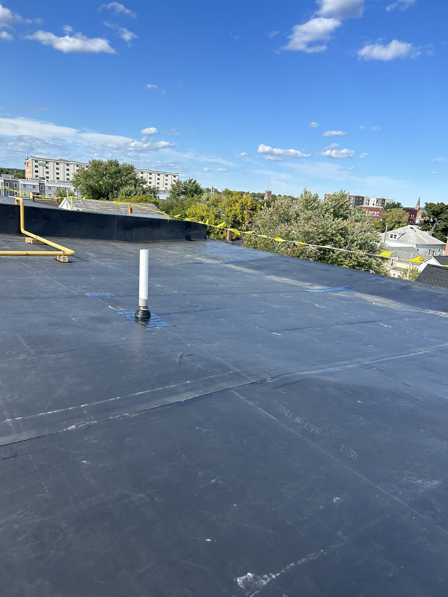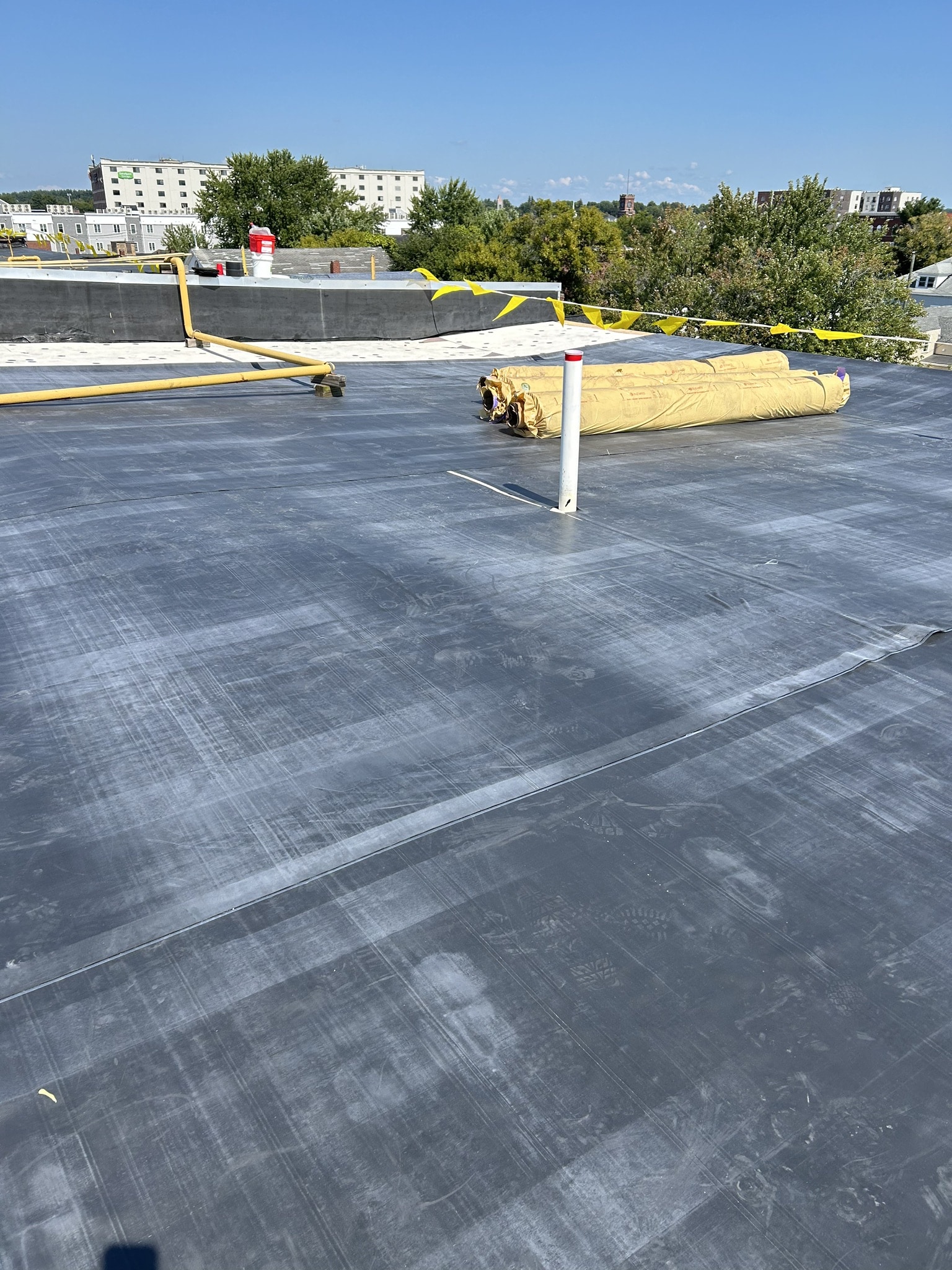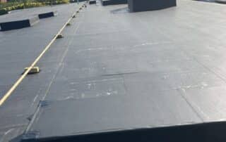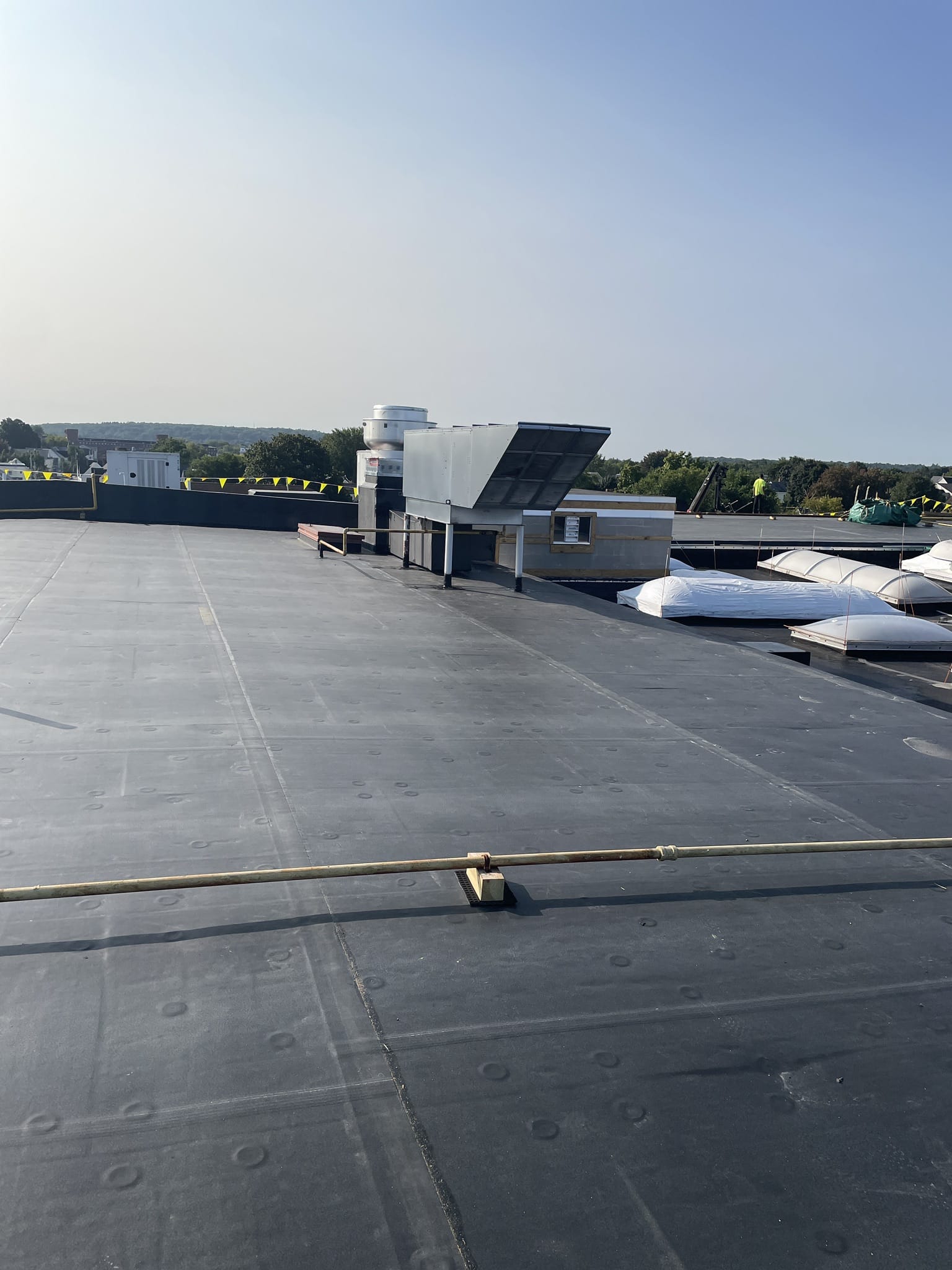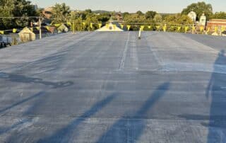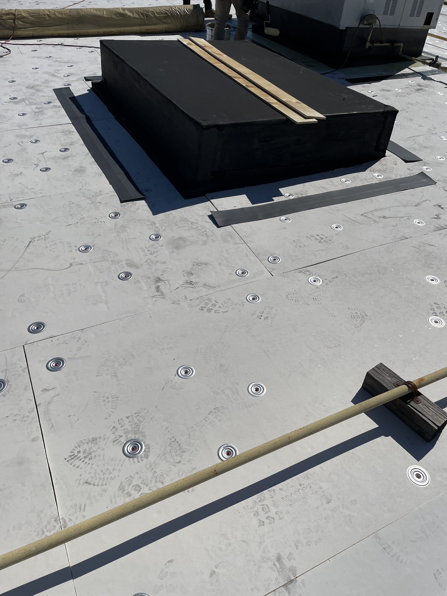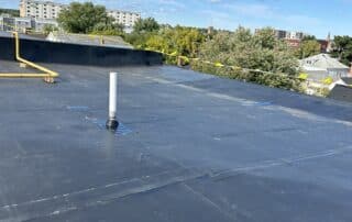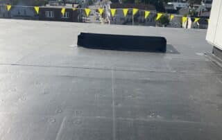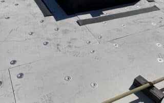 The primary roofing material for this project is EPDM membrane. Cutting the existing membrane, fastening half inch HD board, adhering the new EPDM membrane, and installing term bar at walls along with new perimeter edge metal.