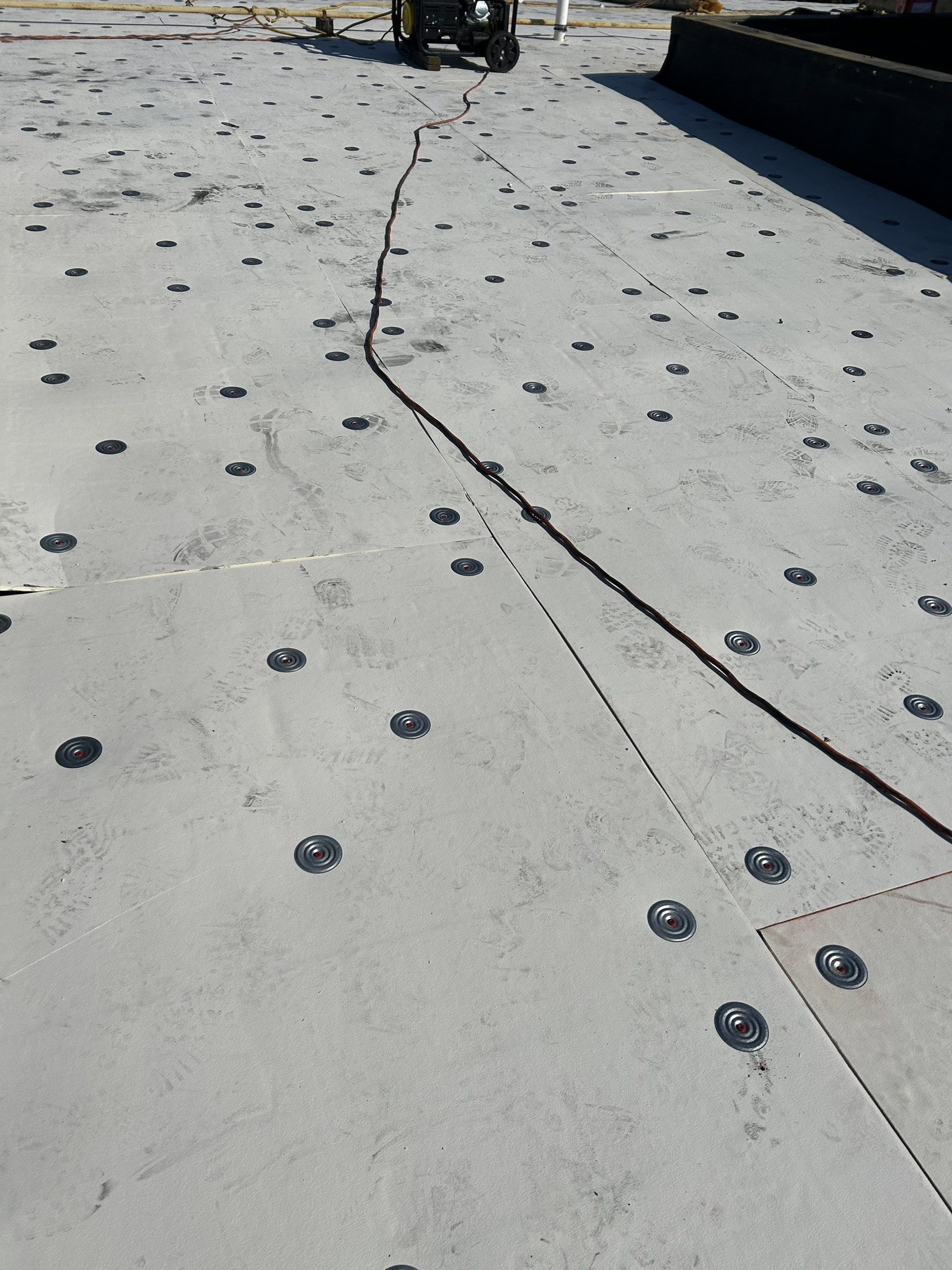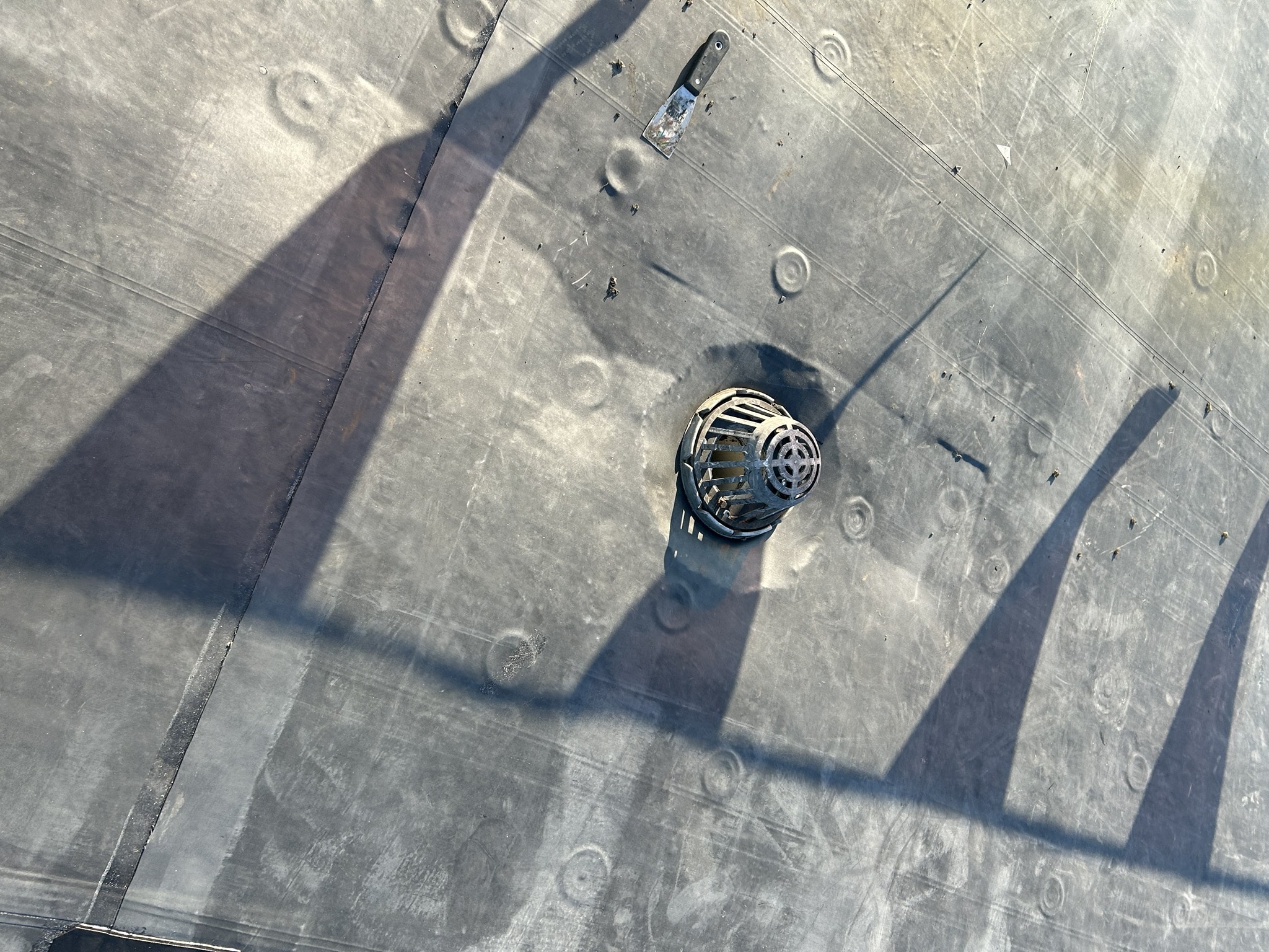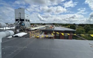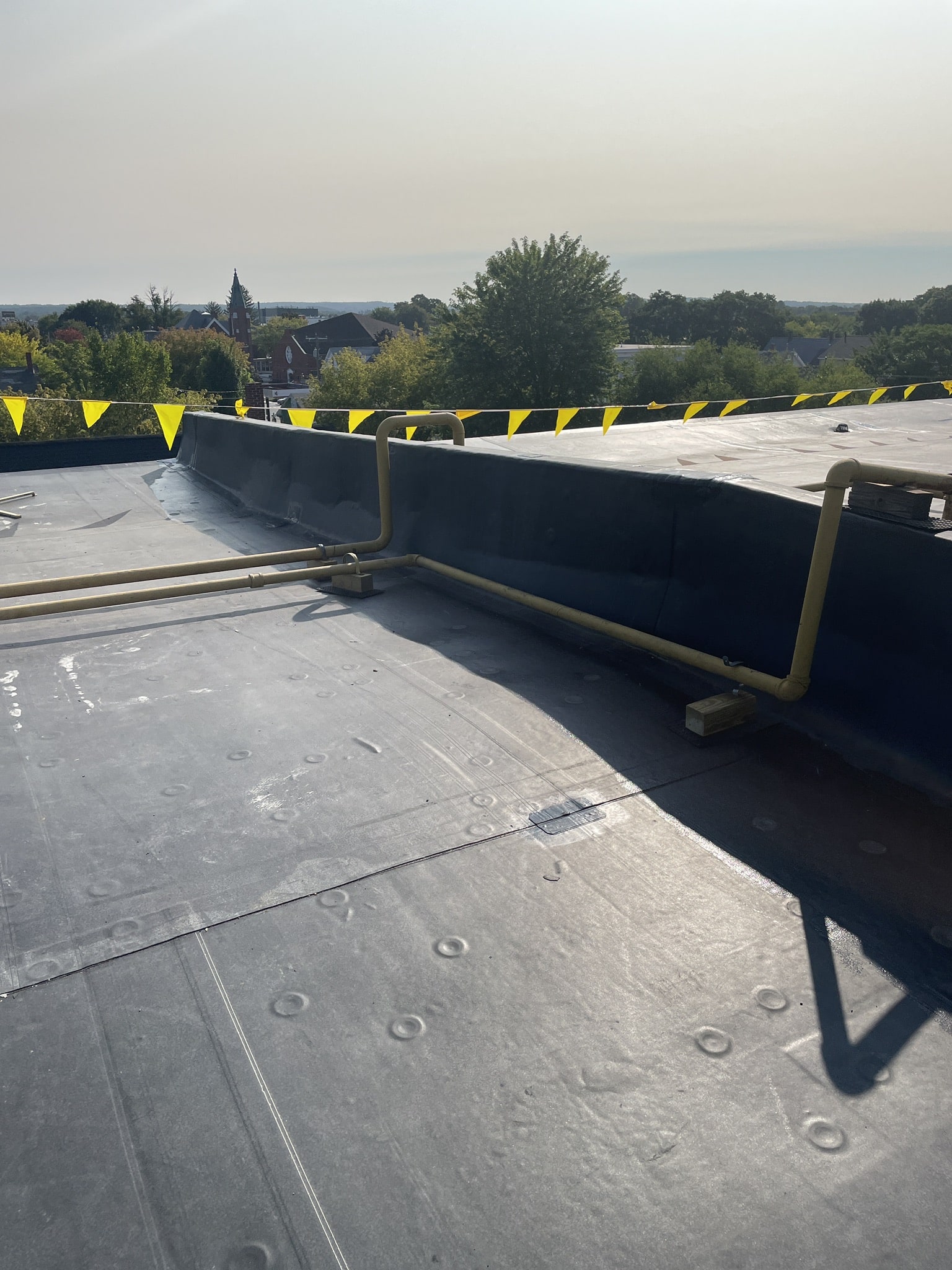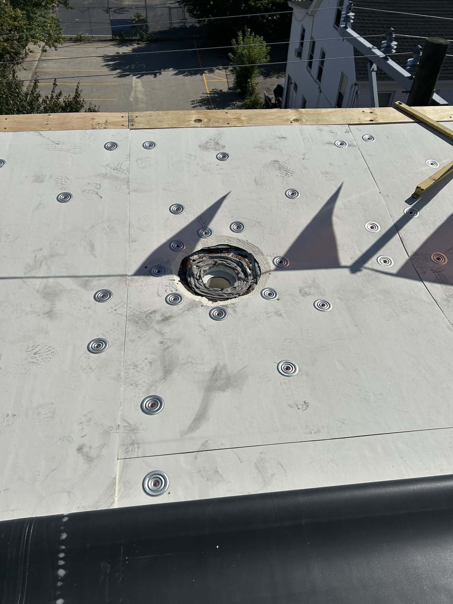 The primary roofing material for this project is EPDM membrane. Cutting the existing membrane, fastening half inch HD board, adhering the new EPDM membrane, and installing term bar at walls along with new perimeter edge metal.
